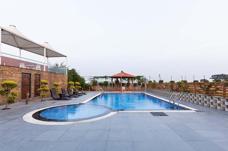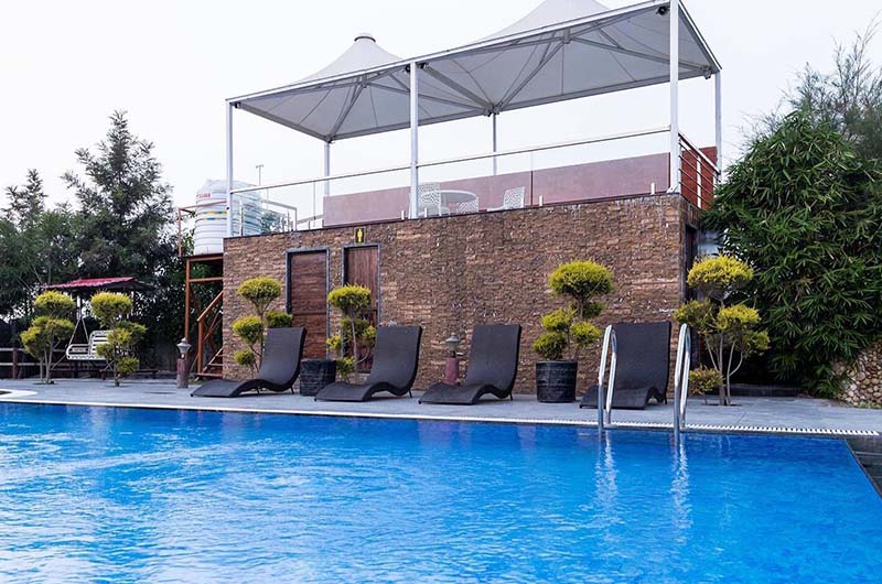 It has 5 feet swimming pools. There is a separate pool for kids (2.5 Feet of depth) with relaxation chairs.